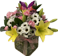 A medium arrangement with lilies, mini carnations, and button daisies.
